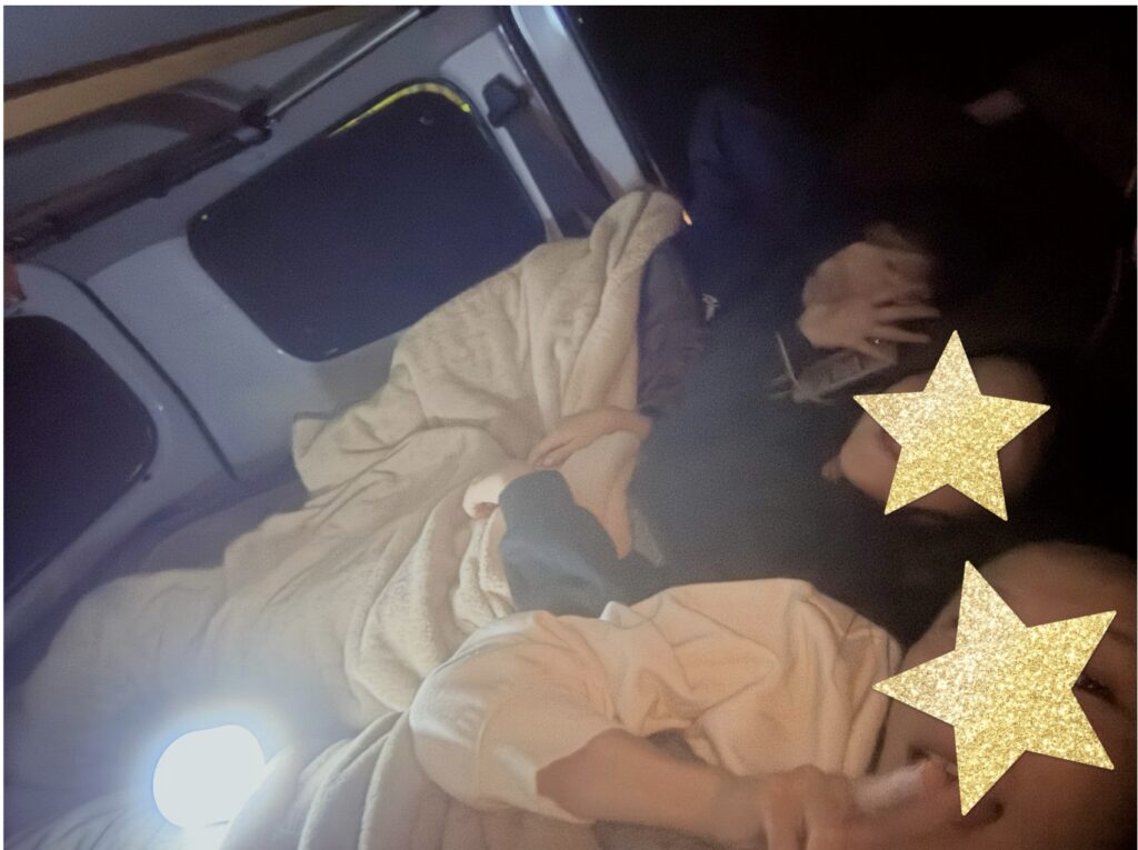 私も7時に出発、と思ってたんですが、子ども達が爆睡で起きないのもあって、のーんびり、コーヒー飲みながら、窓の結露を拭いたり。自分の寝袋を丸めて袋に収納したりしてました。