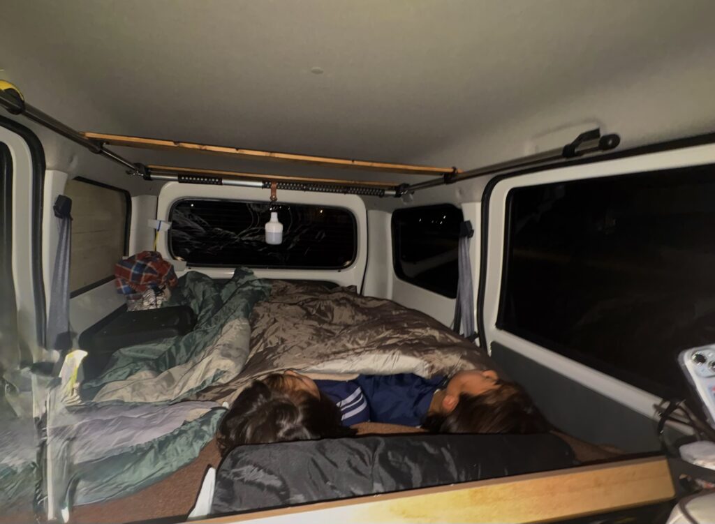 九四オレンジフェリーで深夜2時過ぎに八幡浜フェリー乗り場に到着。フェリーでも爆睡していましたので、子ども達は、眠くて眠くて車に乗り込むとすぐ後ろのベッドキットでぐっすり、睡眠の続きに入りました。そのままの車をすぐそこの道の駅八幡浜みなっとの駐車場に移動させて、窓にシェードを付けて、トイレだけ行った後、私も、子ども達の横に潜り込んで爆睡しました。