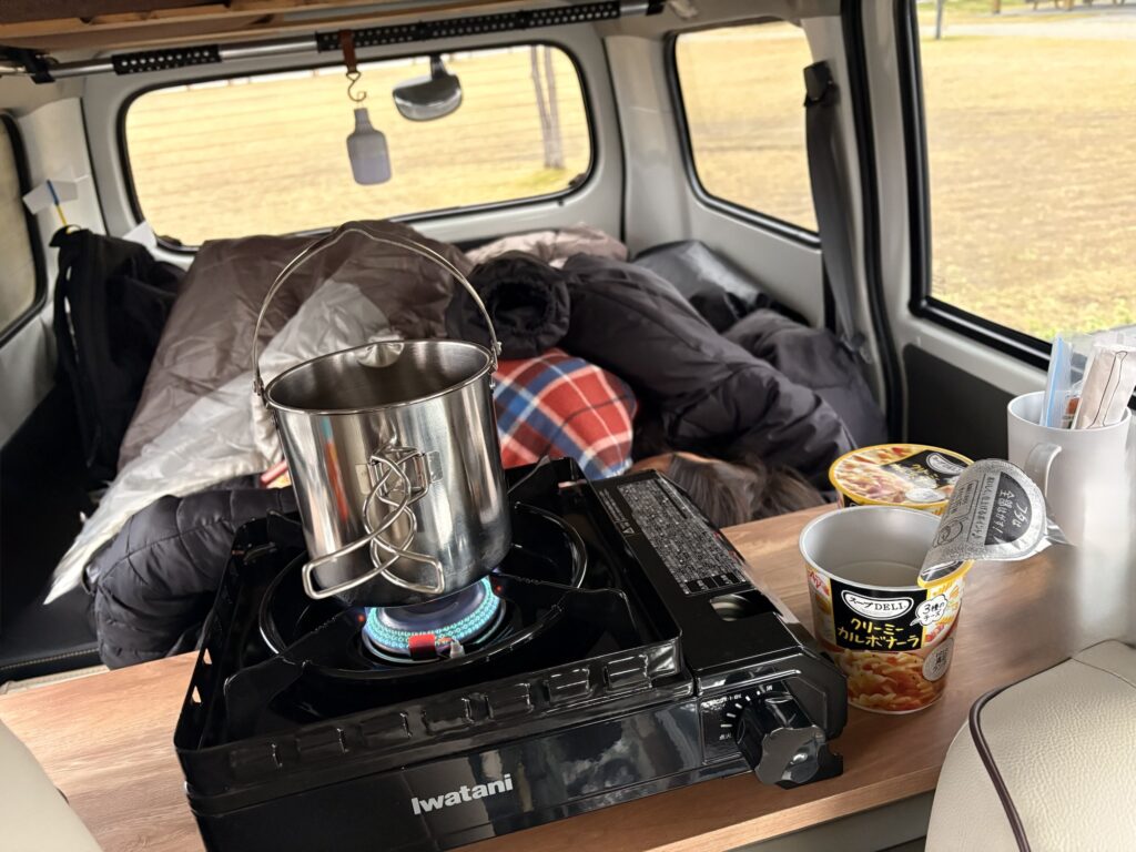 車内でお湯を沸かす時、我が家が使うのはカセットコンロ。周りに燃えるものがないか十分確認して、子ども達にも火を使うことをしつこいくらいに伝えて、万が一がないようにします。