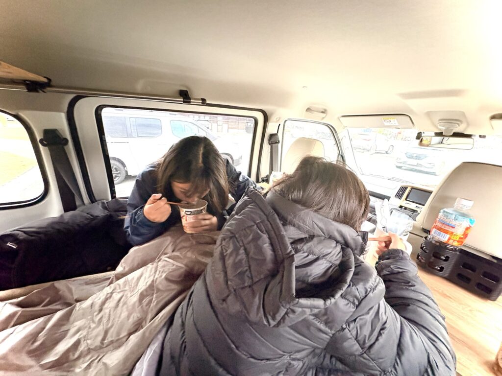 沸かしたお湯で、スープパスタを作って朝ご飯。コーヒーも入れて、ぽかぽかに温まりました。