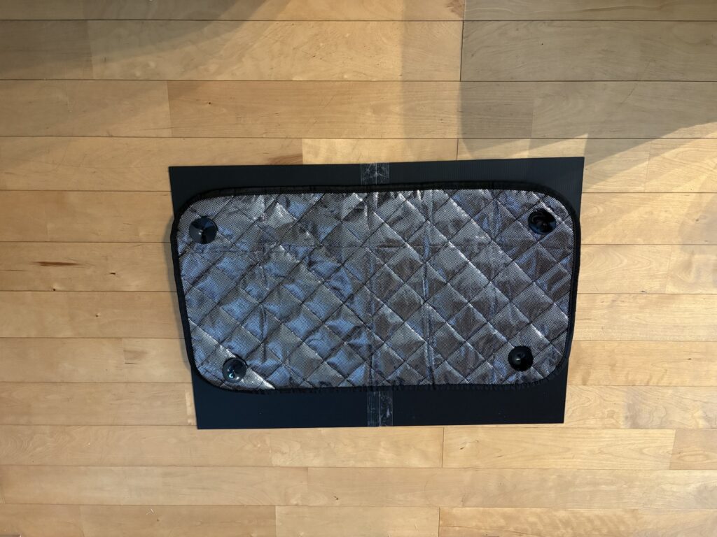 全窓対応なので、型に使えばぴったりのはず。隙間に挟み込む部分を1cm位考慮してひと回り大きくカットしてみました。でも横は、2枚貼り合わせても、ギリギリか、ちょっとだけ小さい感じ。