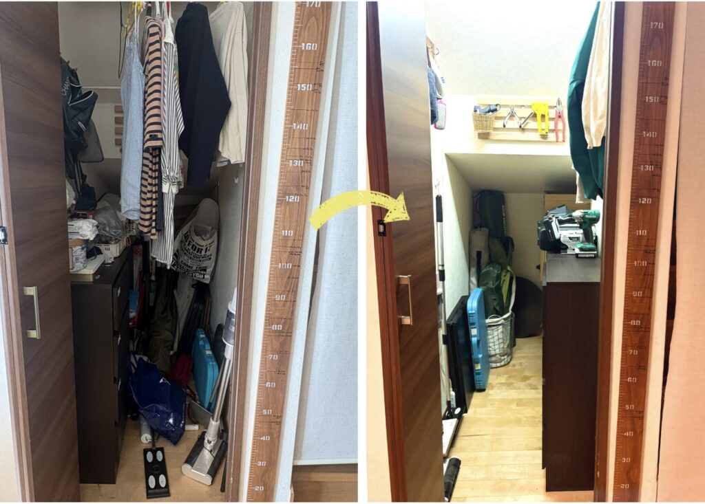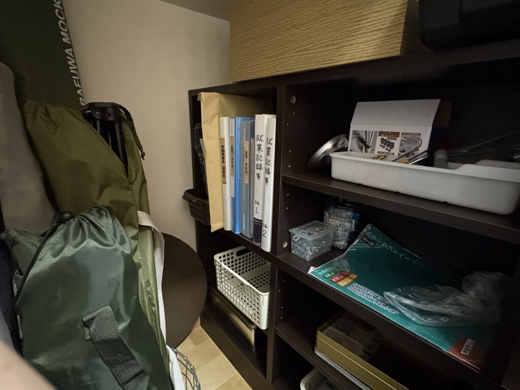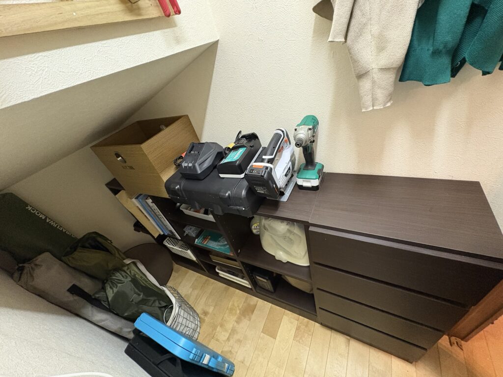 一晩考えて、掃除道具、DIYグッズ、アウトドア系(チェアとかハンモック)、取扱説明書とか仕事関係の書類ファイルなどを収納することにしました。