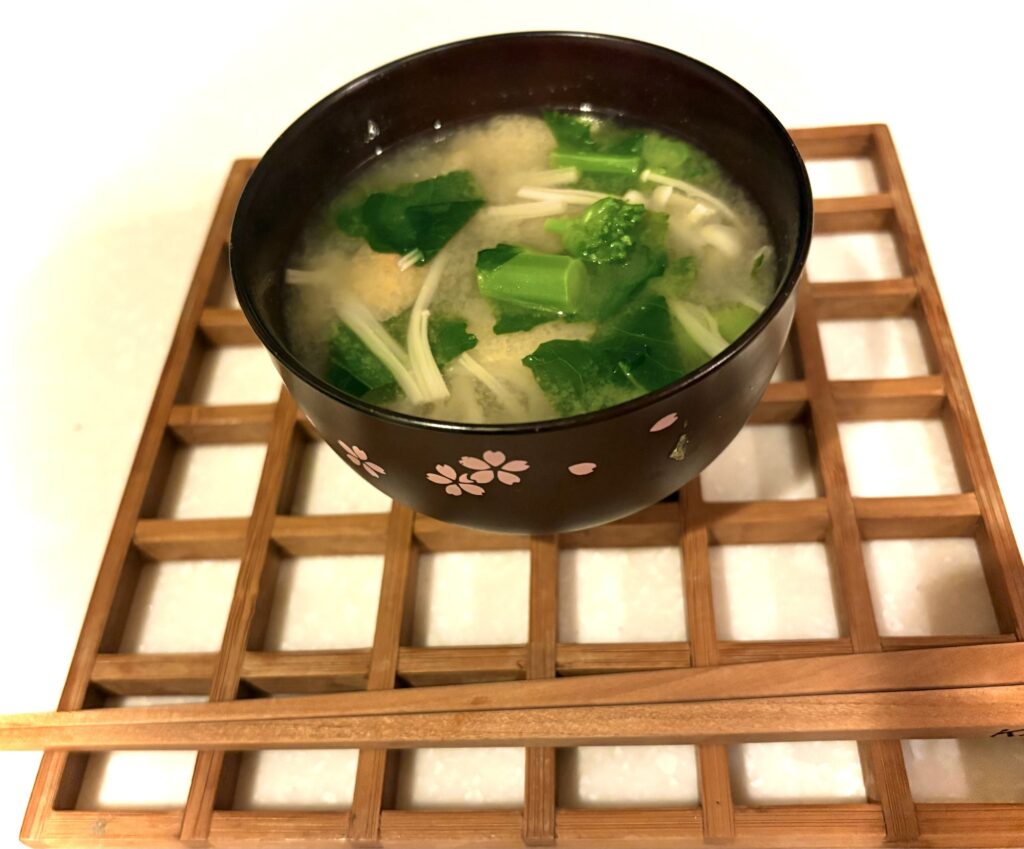次の日は、使うつもりなかったんですが、お味噌汁作ろうと思ったら、味噌汁の具になりそうなものが冷蔵庫にエノキと油あげしかなくて、庭でポキっと収穫してきて使いました。