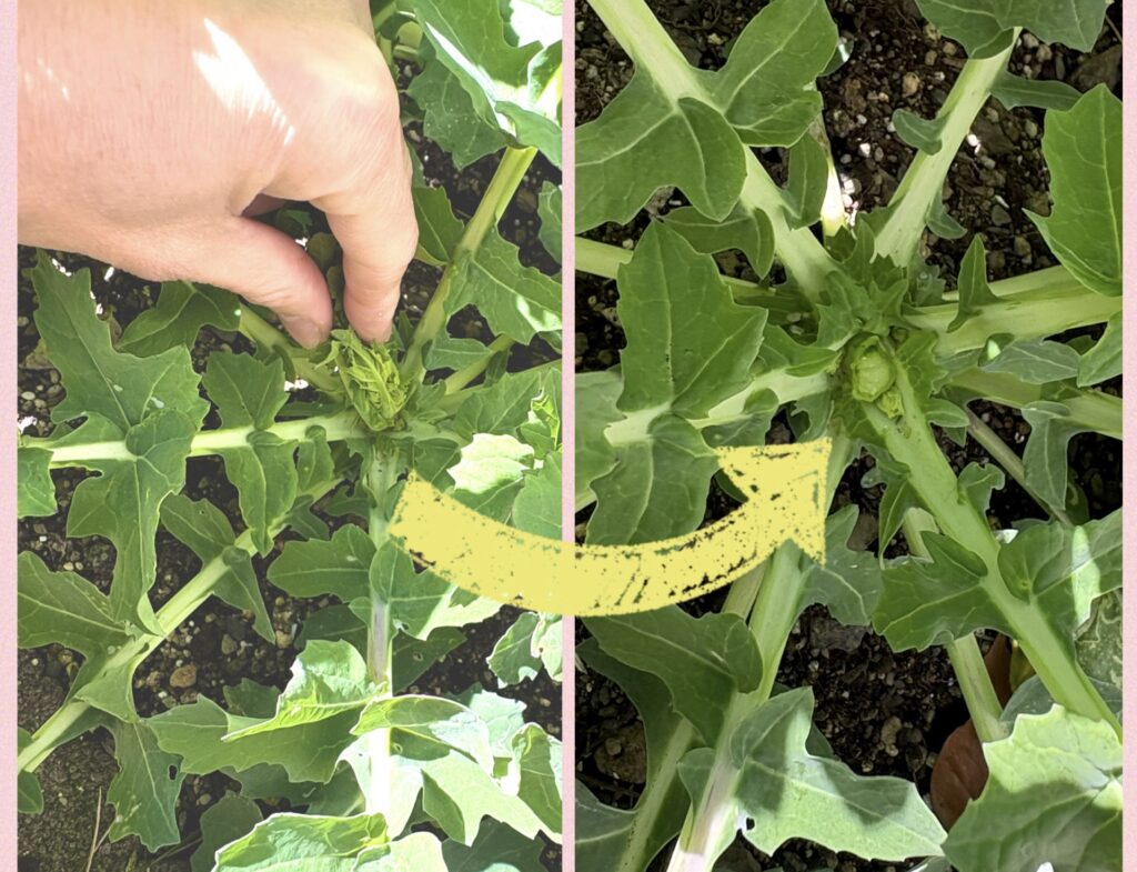 2月下旬ころに摘心をすると、脇芽が増えて、収穫量が増えるそう。せっかく育ってきている中心を切り取るのはちょっと、かわいそうな気がしましたが、やりました。