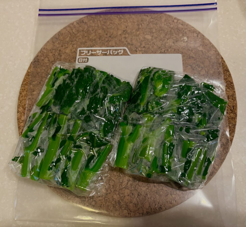 こんな時は冷凍保存。塩茹でして適当な大きさに切ってラップで包んでジップロック。