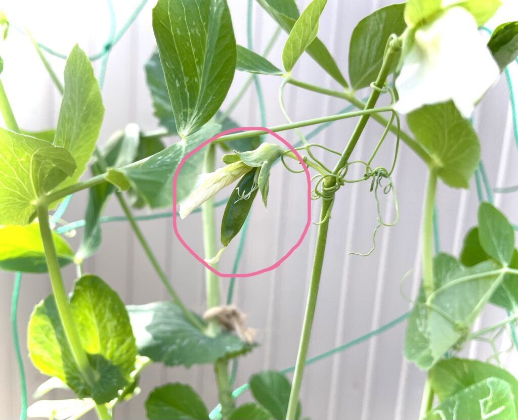 花の間からスナップエンドウの赤ちゃんが見えてます!かわいい!