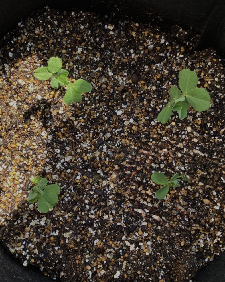奥の可愛らしい葉っぱの苗3つが、スナップエンドウです。