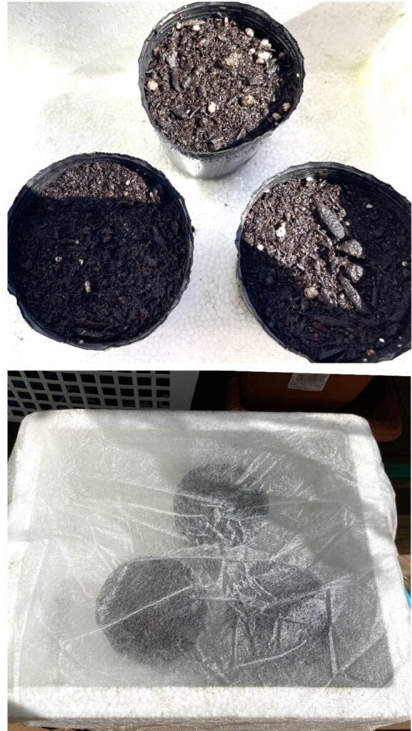 1ポットに4つずつ植えて、鳥に食べられないように、不織布でカバーして、乾燥しないように、水やりして発芽を待ちました。