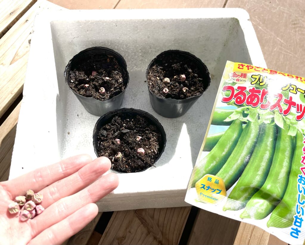 つるありスナップエンドウの苗作りのため、苗ポットに種まきしました。
