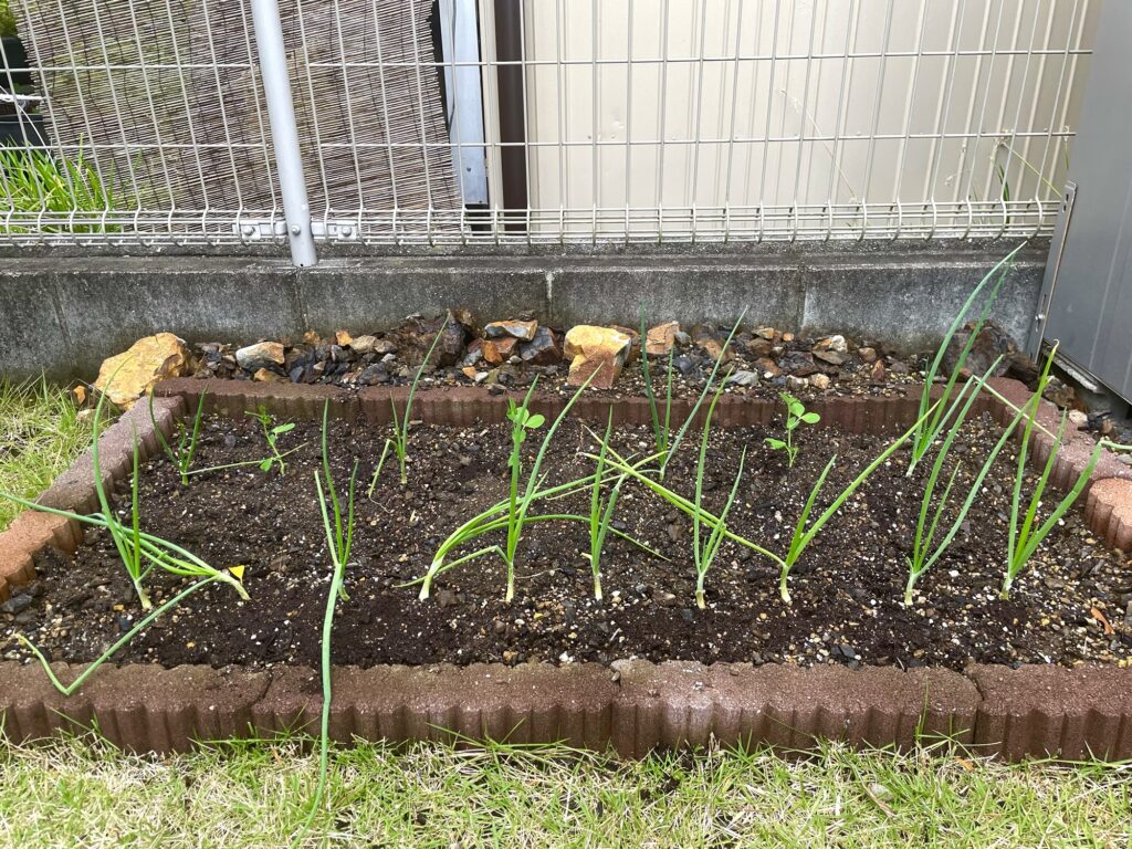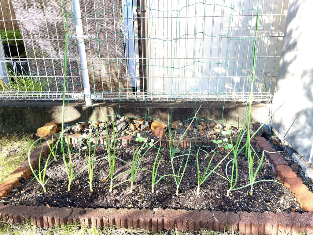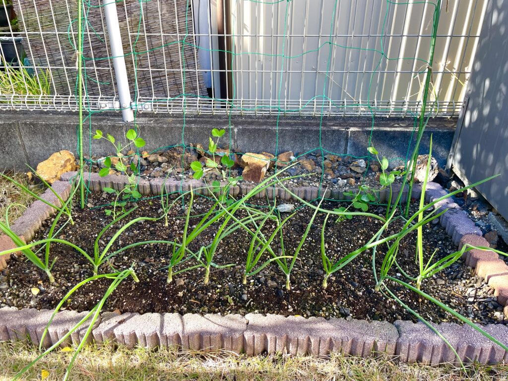 定植しました。玉ねぎと一緒に植えるのは、あまり良くないとの情報もあったんですが、玉ねぎの苗をお友達におすそ分けしてもらったので、一緒に植えちゃいました。