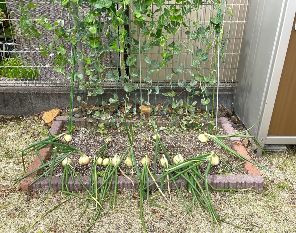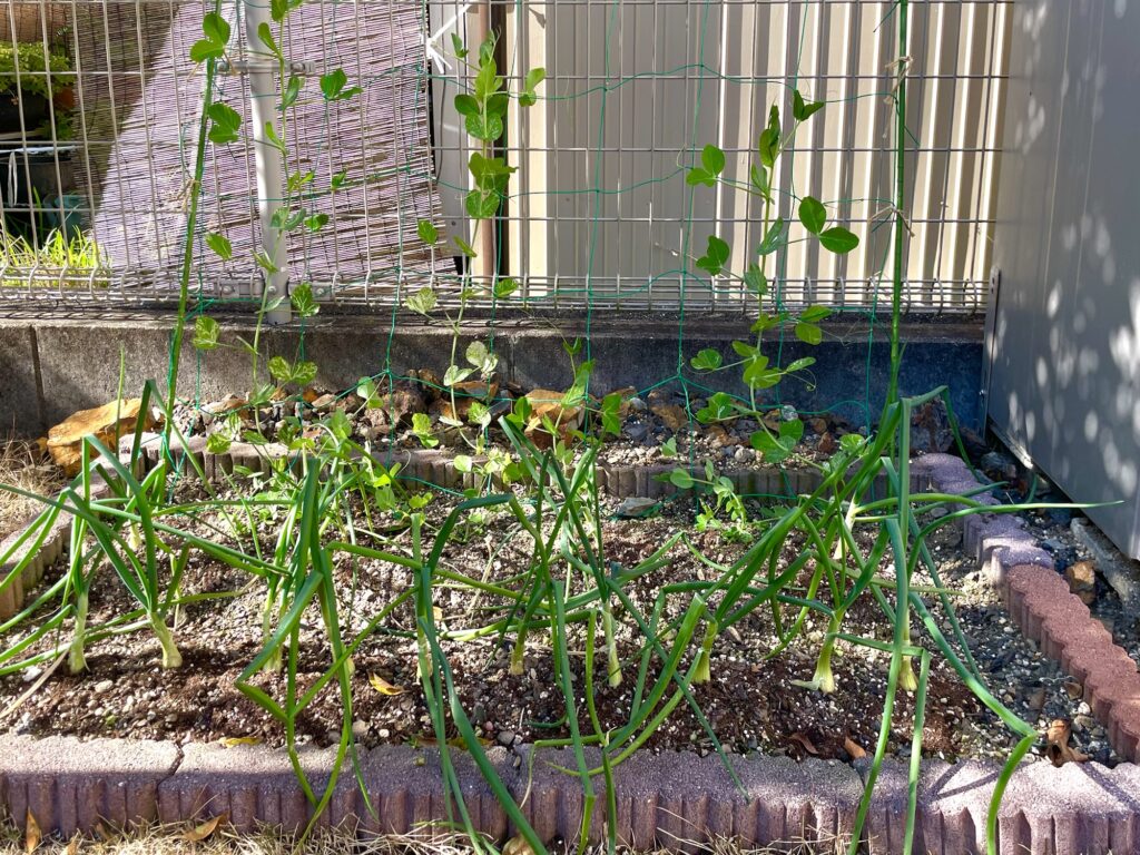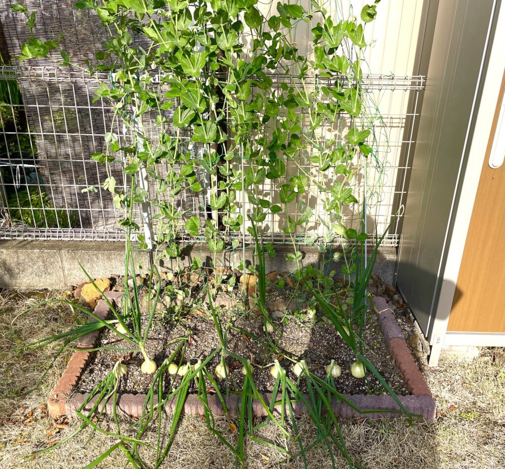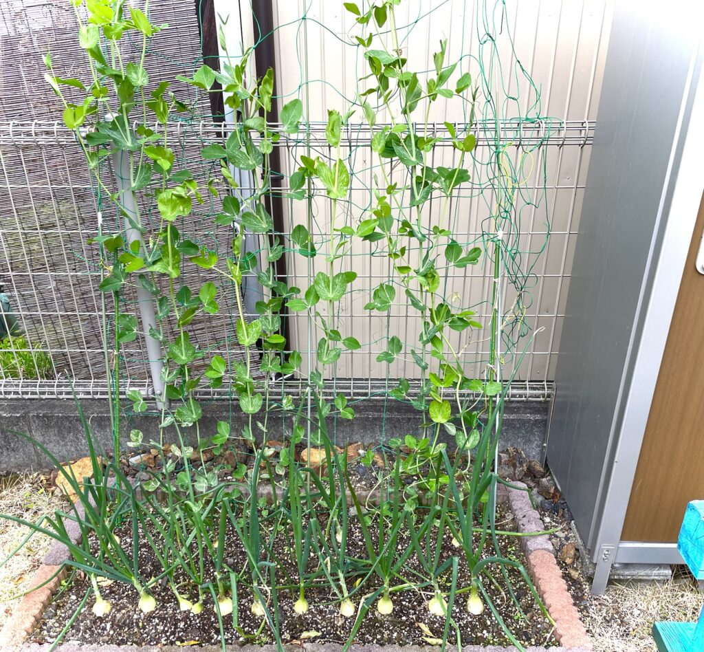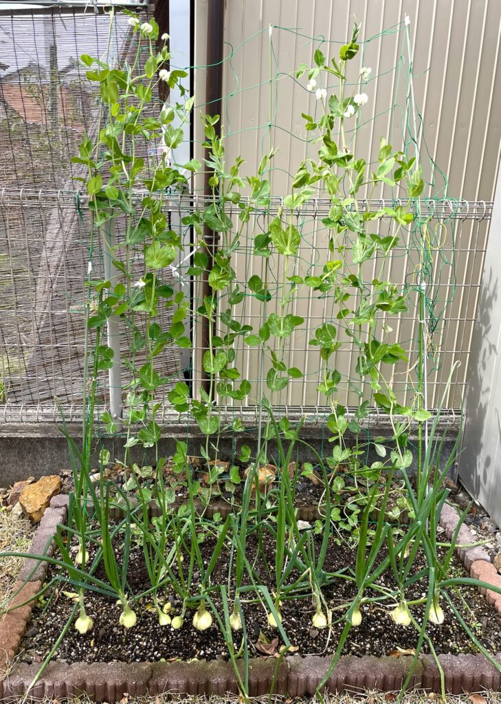 あんまり放っておくと、スナップエンドウのつるが、玉ねぎの葉に巻き付いて、玉ねぎが締め付けられてしまっている状態が何度かあり、優しくつるをほどいて、ネットに誘導しなおしたりしながら、でも、ほぼ放置。。