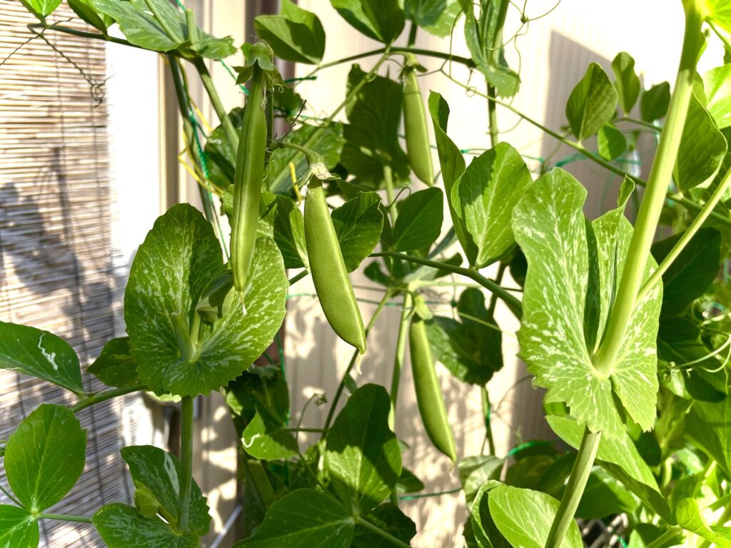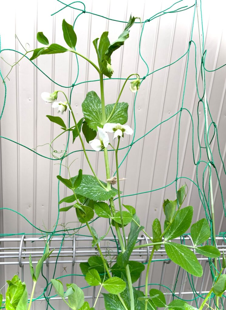 5月中旬、下の方の葉っぱが白っぽくなってきて、どうも、うどん粉病発症です。薬剤散布でもうちょっと粘ろうかとも思いましたが、もう、スナップエンドウはいいです、という子どもの声もあり、終了としました。